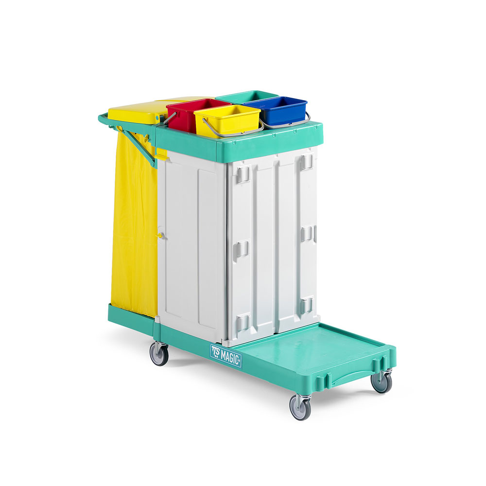 Carro funcional com coletor fixo ( sem prolongador ) de 120 litros, com tampa e saco de nylon de 120L com ziper. Possui uma bandeja central, 01 armario fechado com chave e porta chave. 01 gaveta de 10 litros sem chave, espaço na base para balde. possui tambem 02 fixadores de cabo e 02 ganchos. A base tem 04 rodizios de 4 polegadas.